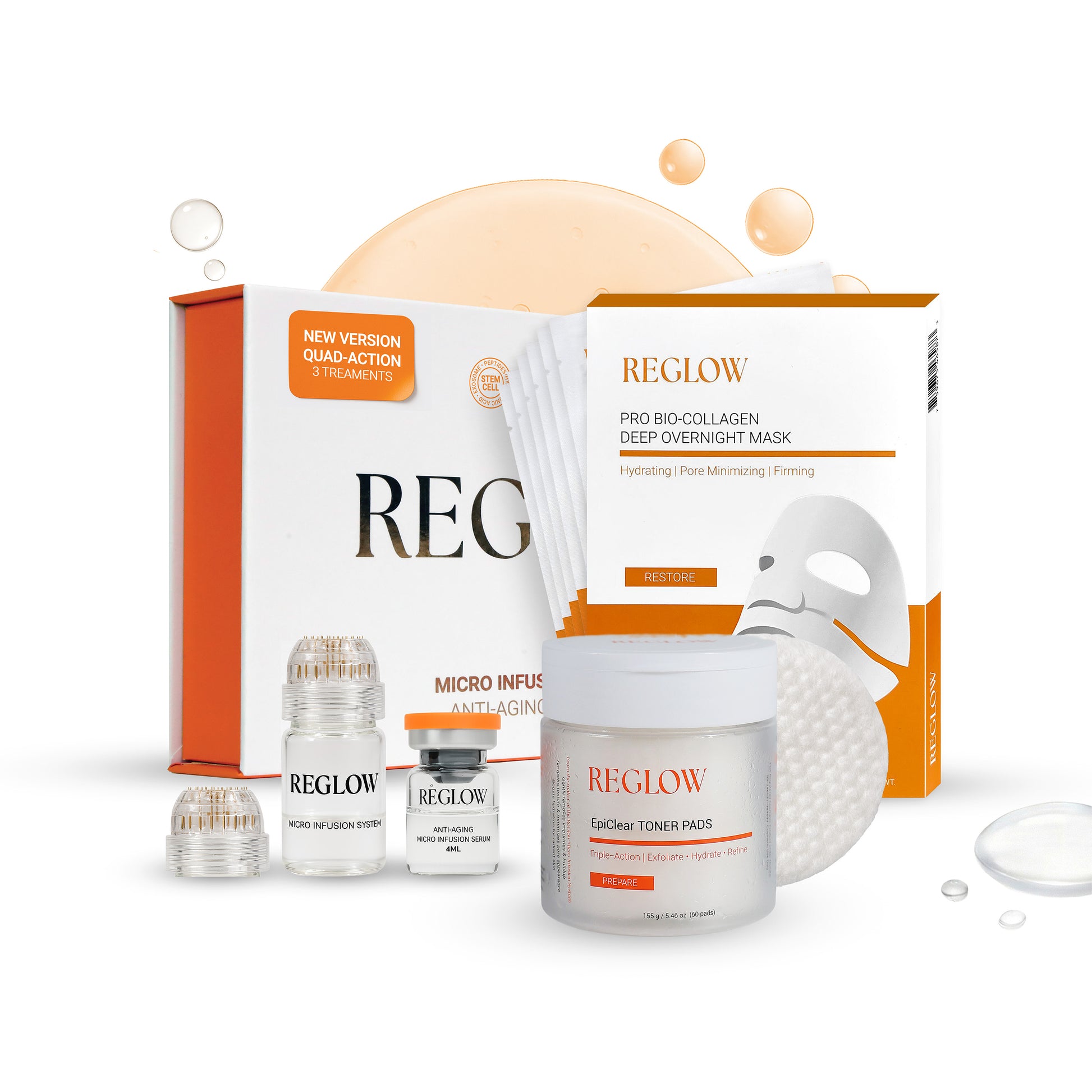 Essential Home Facial Routine: The perfect starter kit for the ReGlow experience. A 3-step protocol designed to prep, treat, and hydrate the skin for visible results.